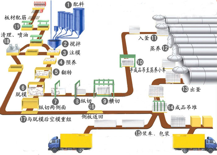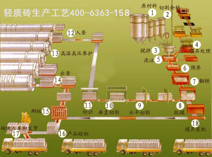1)原料貯備倉→(2)計(jì)量配料→(3)原料加水混合攪拌→(4)模具準(zhǔn)備→(5)澆注→(6)發(fā)氣靜停→(7)脫模→(8)翻轉(zhuǎn),水平切割、垂直切割→(9)編組入釜→(10)高溫高壓養(yǎng)護(hù)→(11)成品出釜→(12)檢驗(yàn)成品→(13)碼垛貯存→(14)出廠
