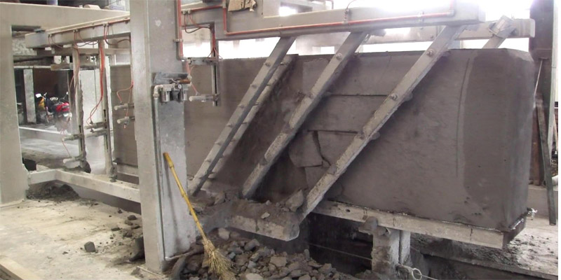 手動(dòng)切割是一種簡單的切割方式,在模箱內(nèi)按所需規(guī)格尺寸于澆注前預(yù)先安置鋼絲。豎切時(shí),用吊具緩慢的提拉模箱即可,縱切可用人工來按照規(guī)格切割,這種方法在切割過程中,如遇到行車提拉不穩(wěn)定,忽快忽慢,或者遇到夾雜物,可能引起鋼絲偏移,造成切割的不準(zhǔn)確,手動(dòng)切割精度比機(jī)械切割稍微差一點(diǎn)。