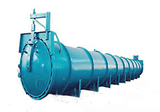 壓制出的制品直接碼垛到蒸養(yǎng)小車上,再經(jīng)過擺渡車入編組軌道,編組后的蒸養(yǎng)小車經(jīng)卷揚機牽引至蒸壓釜內(nèi)。在蒸壓釜的高溫蒸汽養(yǎng)護下,讓其坯體中的料發(fā)生作用,從而獲得移動的強度和各種性能,形成穩(wěn)定的產(chǎn)品。養(yǎng)護分升溫、恒溫、降溫三個階段。關(guān)閉釜們后,抽真空0.5h,送蒸汽加溫2h,恒溫8h,降溫1.5h即可。出釜后的蒸養(yǎng)小車返回成型階段等待循環(huán)利用。